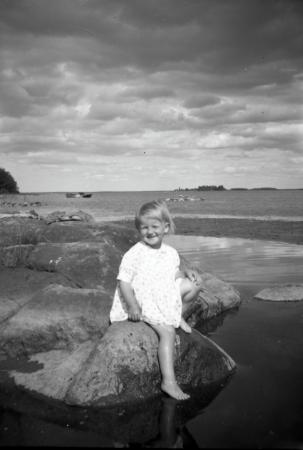 Sandin är lockande, men gropen vid Bondbäckens utlopp med det mörka, äckliga vattnet måste man över. Och här fanns blodiglar (sades det)! Foto 1955.