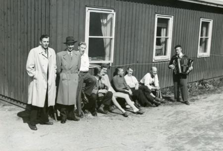 Ämnesord: män, pojkar, fritid, varvsindustri, dragspelare, söndag, barackbostäder |