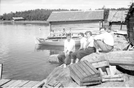 Ämnesord: ungdomar, båtar, hav, hamnar, stränder, båthus, solbad |