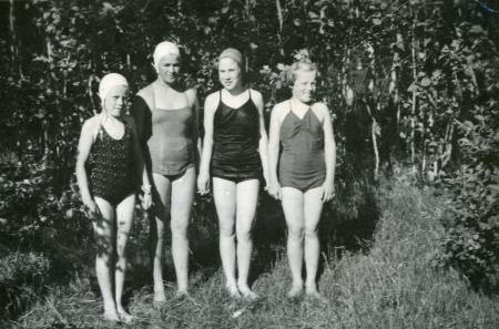 Ämnesord: ungdomsföreningar, sommar, simning, tävlingar, flickor, vatten, stränder, festligheter, baddräkter, öppet vatten-simning |