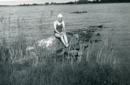 Ämnesord: ungdomar, skärgårdar, fäbodar, hav, flickor, stränder, simmare, baddräkter, öppet vatten-simning |