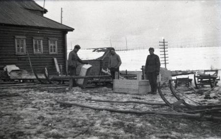 Ämnesord: krig, soldater, vinter, slädar, timmerbyggnad |