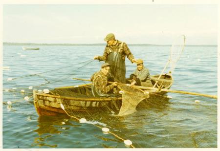 Ämnesord: fiskare, hav, lax, åror, fisknät, roddbåtar, regnkläder |