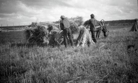 Ämnesord: jordbruk, skördearbete, häst, kärror, råg |